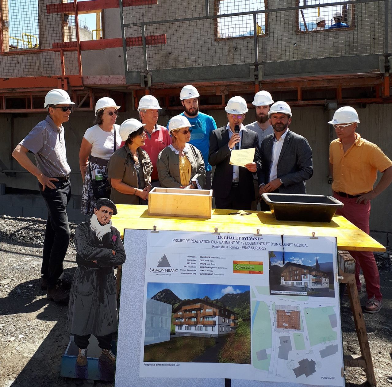 La 1ère pierre des 12 logements locatifs aidés et du pôle médical de l’opération « Chalet Sylvand » a été symboliquement posée ce mercredi 10 juillet au cœur du nouveau quartier de centre-village autour de l’église de Praz-sur-Arly.